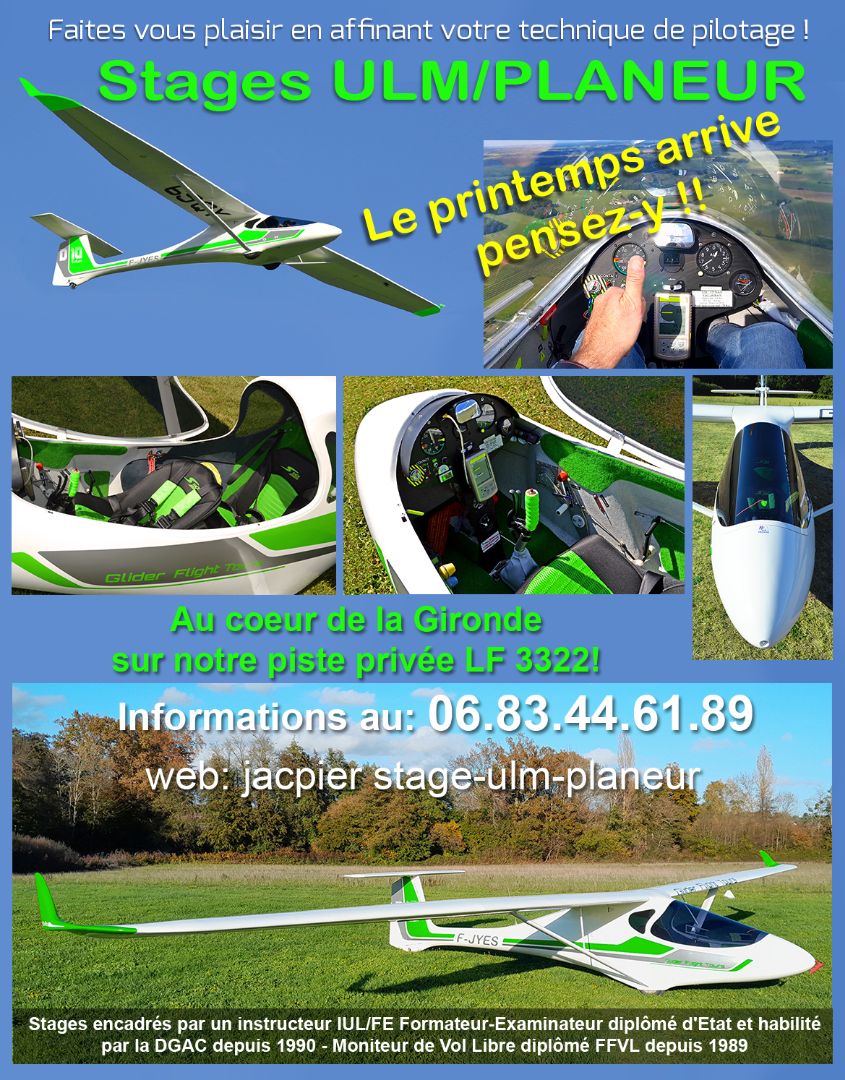 Renseignements au 06 83 44 61 89 - web: https://jacpier.wixsite.com/stage-ulm-planeur/contenu-stages